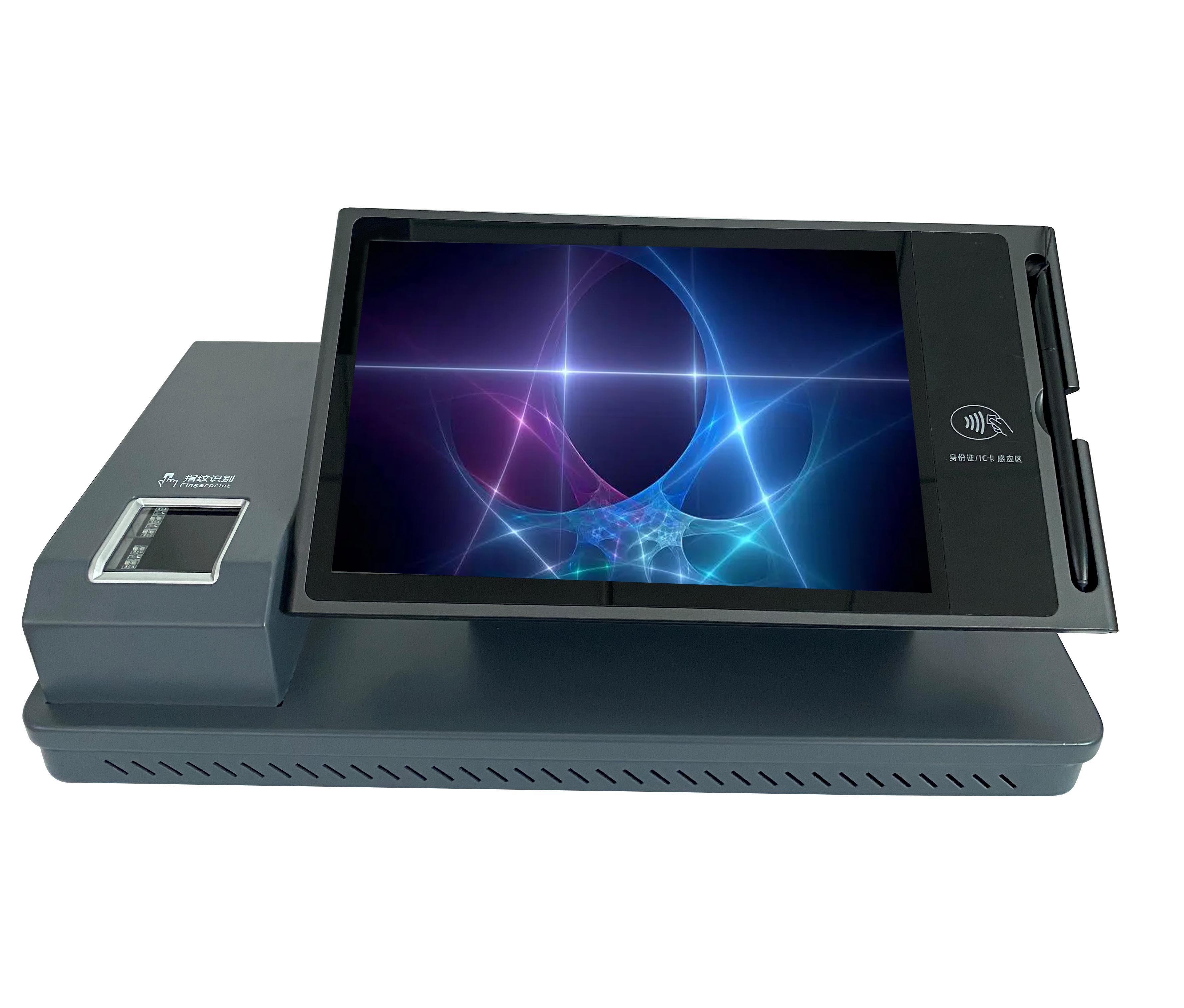 综窗通采用柜内清和柜外清组合的形态产品。内置国产主控走USB-HID的形式:集成了电磁手写屏、居住证、出入境指纹、人口指纹、扫码模块、触摸屏、单/双目摄像头、身份证阅读器、现场制证采集平台、喇叭、评价器等。支持人口、交管、出入境三大业务系统。在用户办理不同业务时,综合调用对应模块,再通过设备自带系统和软件预处理一部分数据,形成完善的通办智能系统。全功能版本,集成了11个模块,适合所有业务窗口。